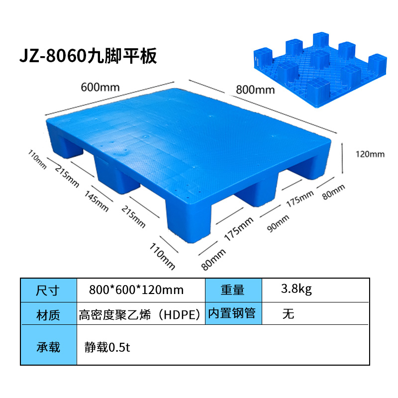 九腳平板塑料托盤底部為“九腳形”設(shè)計的塑料搬運制品,其表面為平面,廣泛應(yīng)用于紡織廠、食品廠、醫(yī)藥廠等企業(yè)。這種托盤的設(shè)計特點包括輕質(zhì)、平穩(wěn)、美觀,無釘無刺,無毒無味,耐酸堿,不腐爛,不易被細(xì)菌繁殖,易清洗消毒,不助燃,無靜電,無火花,防暴,防滑溜,回收價值高。與鋼托盤、木托盤相比,九腳平板塑料托盤具有更好的環(huán)保性和安全性,能夠提升企業(yè)形象,提高物流效率。此外,九腳平板塑料托盤因其表面為平板狀,不易積累灰塵,方便清洗;受力均勻,對貨物有很好的保護(hù)作用;平面上均留有排氣小孔,具有良好的透氣性和防潮效果。這種托盤主要應(yīng)用于倉庫輕型貨物墊倉板、叉車周轉(zhuǎn)較輕貨物使用,不適合于上貨架或者轉(zhuǎn)載大重量的貨物?